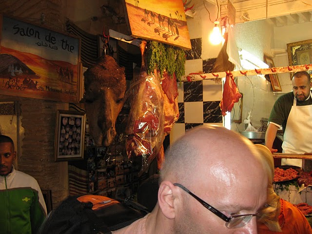 We leave the Riad to visit the famed Fes Souks, which are exactly as I imagined – crowded alleyways with shopkeepers trying to sell you everything from fruits, spices, camel meat, jewelry, clothing, shoes, herbs and more. At first I didn’t see anything I wanted to buy in these shops, although I was taking notice of some mirrors with beautifully decorated mosaic patterned frames. Some of them had little doors on them that opened to reveal the mirror, and many of them had a distinct orange color that I adored. I finally came across one that I decided I must have, with an orange and gold border. I’m told the orange is camel bone with henna dye. I bargain the shopkeeper down to half of what he first asked for, so I probably got a reasonable price for a white tourist. We make our way back through the souks to the clock tower café, where we eat couscous, vegetables, cheese, fruits, almond, banana and date shakes, and…camel meat.