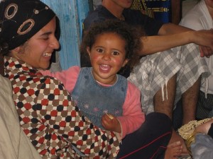 We enter another room off the courtyard, removing our shoes first. We sit around a bench with cushions and the women bring us the olives and fruits we purchased in Essouria. They also bring us bread and olive oil. I’m on the far side of the room – most of the women are sitting at the other end of the room near Tim and Brian, the only Arabic speaking people in the group. One of the family members comes over and sits near me. She starts breaking the bread and motioning for me to eat. I take a bite and say “beneen,” one of the two Arabic words I’ve learned – meaning delicious. The little toddler girl walks into the room and bursts into giggles. Everyone is laughing and smiling at her. The woman next to me is also laughing, and we exchange a glance, which sends us into a whole new fit of laughter. She tells me to eat more and I obey. I point to a water reed bag sitting next to her and ask if she made it (using hand motions). She nods and smiles. A child’s laughter, food, art, these are all universally appreciated. I couldn’t verbally communicate with this woman, but we were able to carry out an entire conversation while eating in her home.